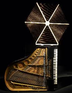 Dans cette installation, les ondes électromagnétiques de l’air ambiant sont captées par une antenne et converties en petits électro aimants qui font vibrer et chanter les cordes d’un piano à queue.