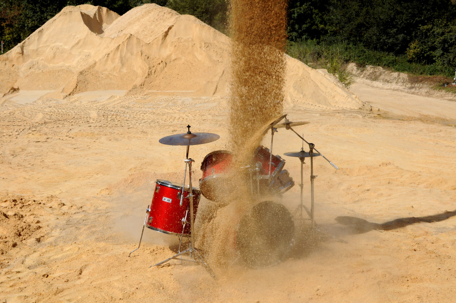 « Fade out » ou « fondu de sortie » est un terme technique utilisé en audiovisuel comme en musique désignant une transition ou une fin : une baisse du niveau sonore jusqu’au silence, une disparition de l’image jusqu’au noir. L’œuvre met en scène l’ensevelissement progressif d’une batterie acoustique sous une coulée de seize tonnes de gravier. Chaque impact est amplifié au contact des différentes parties de l’instrument.
